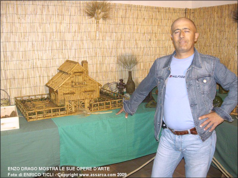 Nella foto Enzo Drago, noto artista aliese, accanto ad alcune delle sue creazioni artistiche in mostra ad Alia in Via Garibaldi