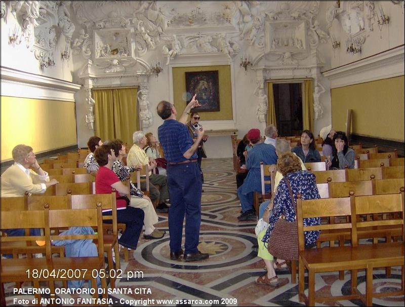 UN NUTRITO GRUPPO DI TURISTI STATUNITENSI,CAPITANATI DAL PROF.MARIO MACALUSO CHE FUNGE DA CICERONE,IN VISITA AL FAMOSISSIMO ORATORIO DI SANTA CITA,RITRATTI NEL POMERIGGIO DI OGGI, 18.4.2007,MENTRE AMMIRANO STUPEFATTI GLI SPLENDIDI STUCCHI DEL SERPOTTA.