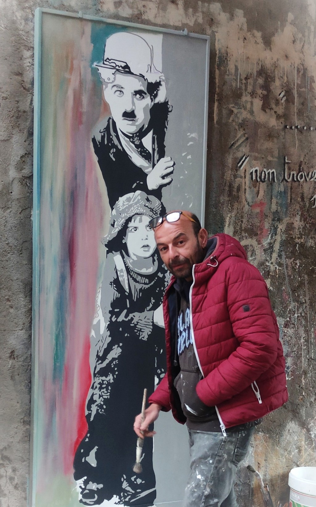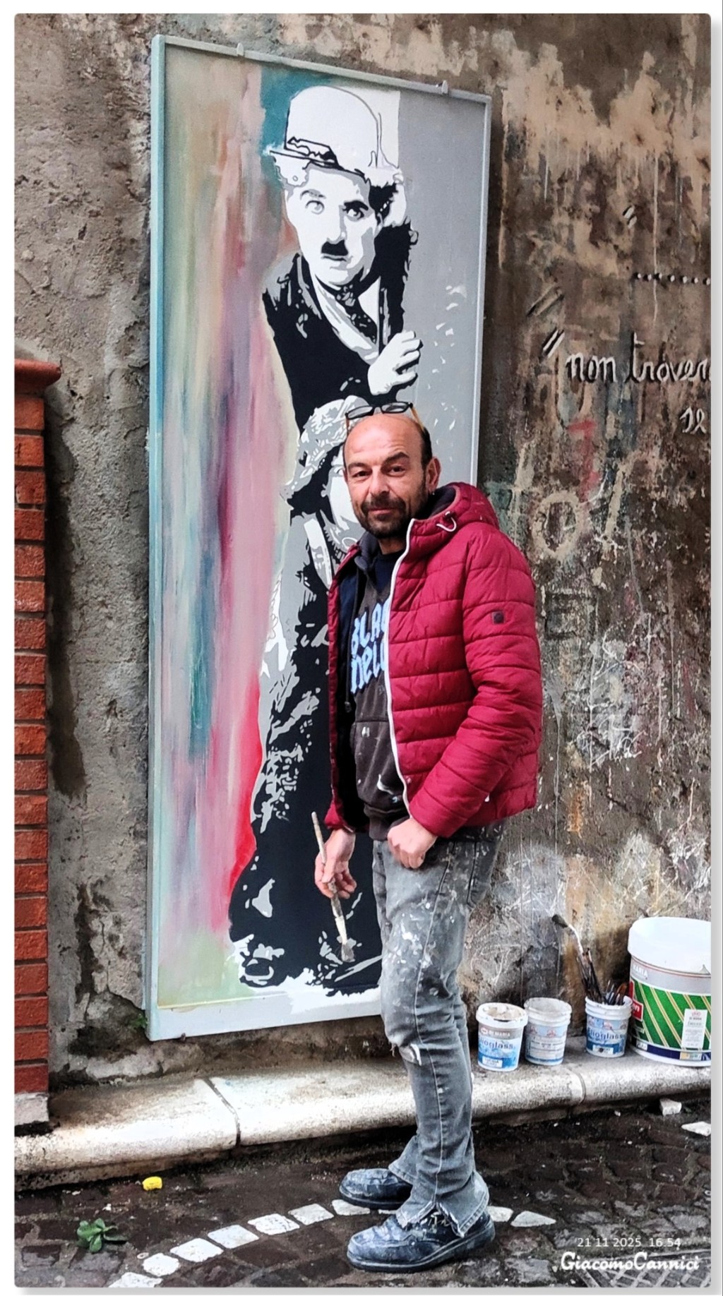 Nino Iovino ripristina il dipinto di Charlie Chaplin.